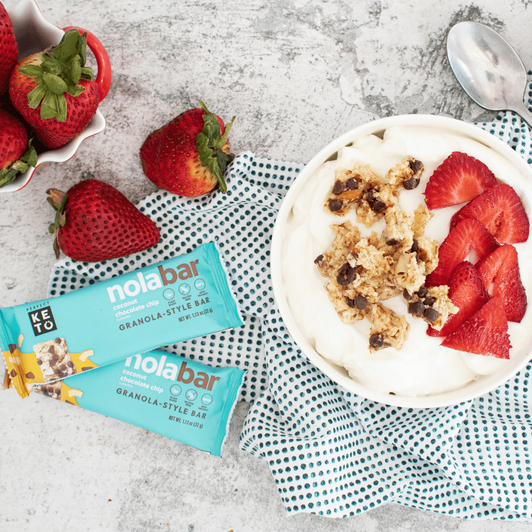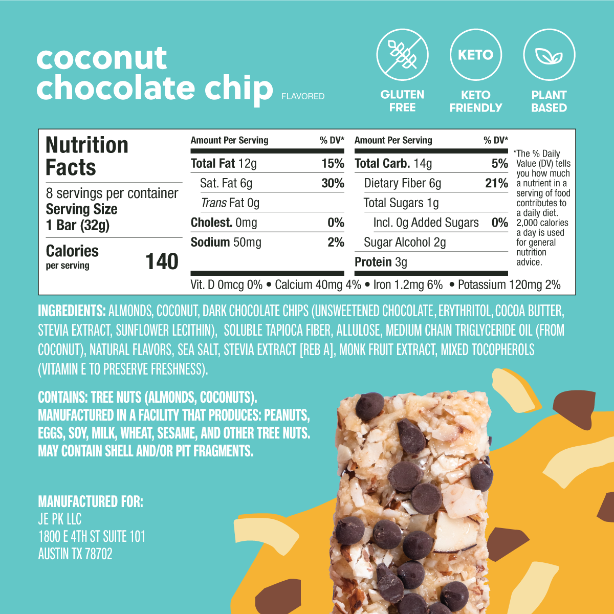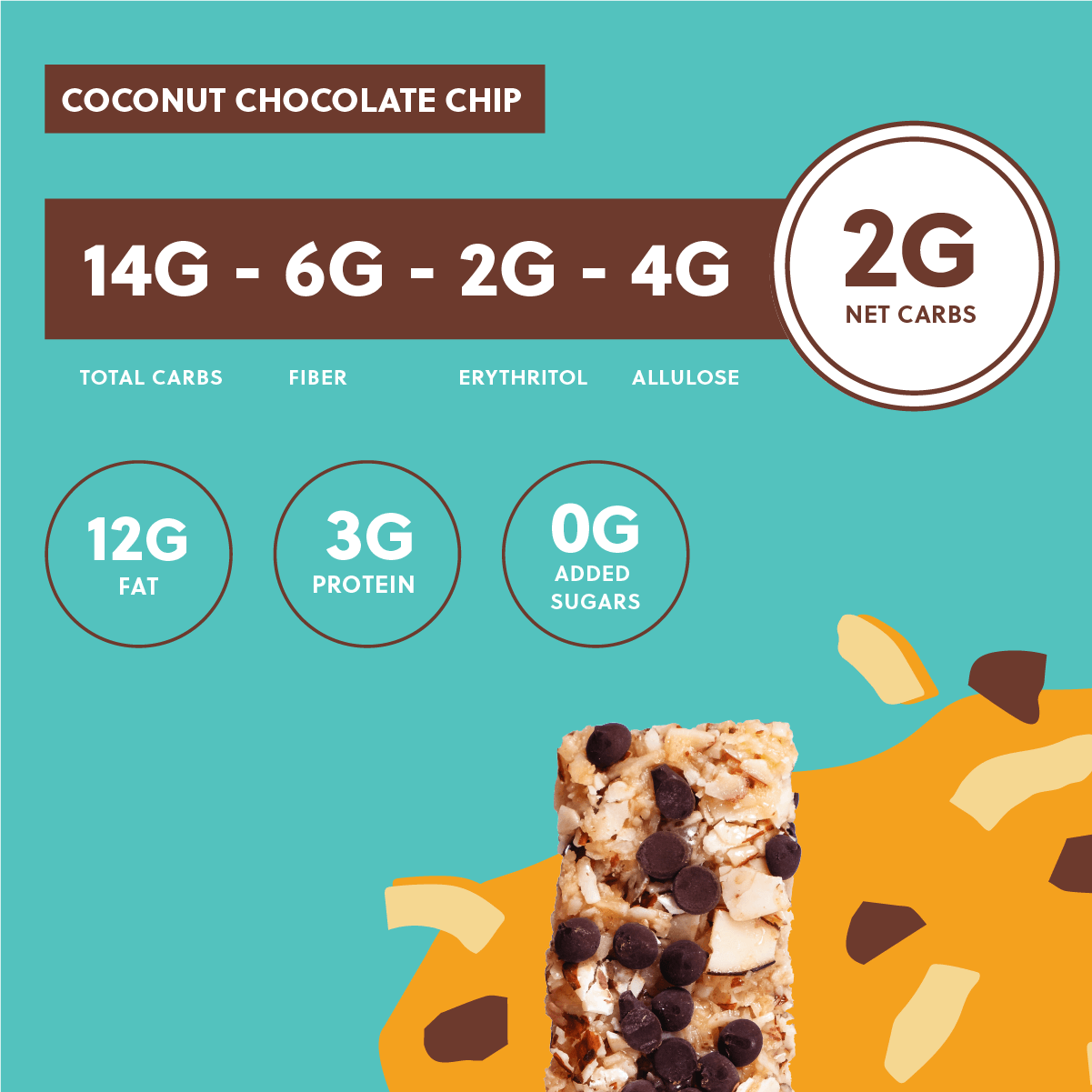 Barras de granola masticables, sin cereales y aptas para dieta keto, con el mismo sabor que las barritas de caramelo. Solo 1-3 g de carbohidratos netos por barra.